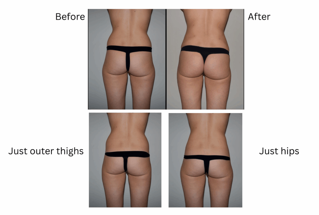 Outer thighs are a critical component in determining the proportions of a woman’s lower body, and these proportions are all about relationships between the waist, hips, and outer thighs. Because when the eye is looking at a woman’s body from behind, it is not seeing each area individually, but rather seeing the curves created by the integration of all the areas. For example, if a woman has moderate protrusion of her hip area and outer thigh area but only chooses to treat one, then the untreated area will immediately look disproportionately large, more than it did before the procedure.
